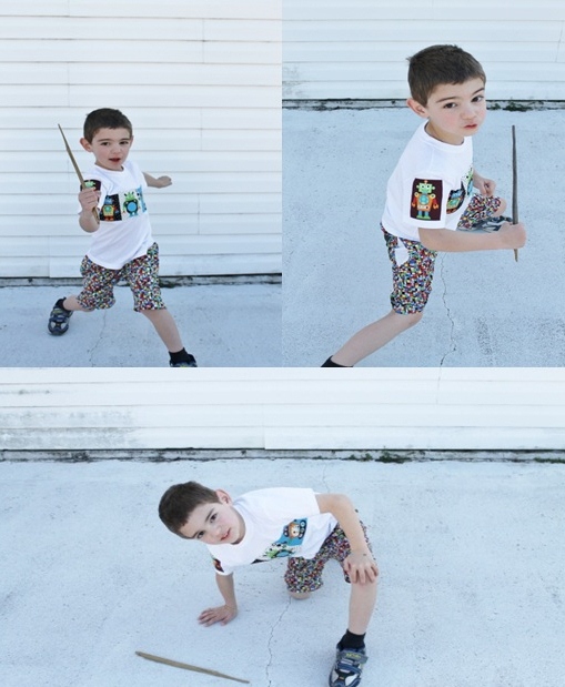 I did something a little different with these shorts. I added interior pockets, and a robot section of fabric for a back pocket. I also added a sneaky robot to the back bottom part of the shirt. Careful, he is watching you from behind.